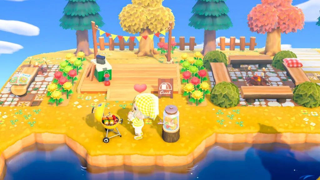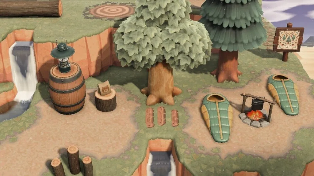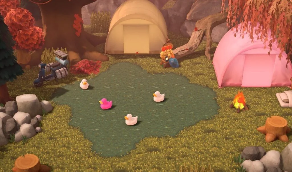 To design this, you need two different colored camps: beige and pink, and a small campfire with a sleeping bag and logs nearby. In the middle, try customizing grass to give it a pond-like look and place four rubber ducks over it.