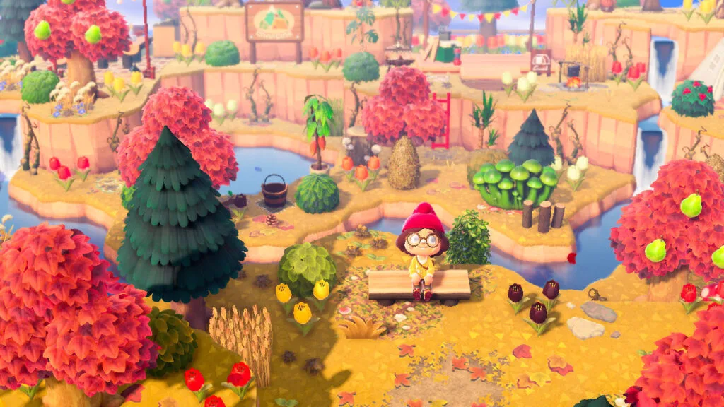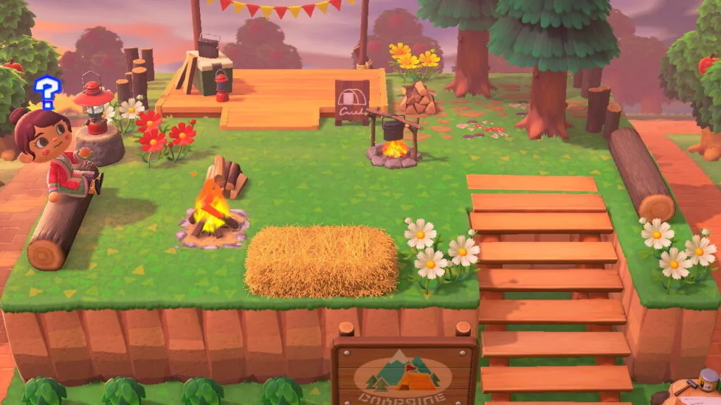 Set up a small raised platform for camp with a camp sign. Place warm, shaded trees around with colorful pennant banner flags for autumn vibes. Also, add a small firepit with log benches around it