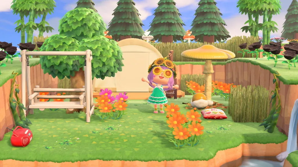 Start by placing colorful flowers around your camp, a wooden swing, soft cushions, and other small plants. If you want, you can also keep a cute radio by your campsite to enjoy the music!