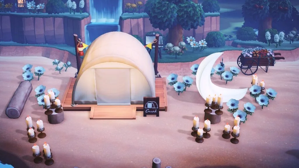 Start by putting white or blue flowers around your camp. In the middle of these flowers, place a crescent moon chair for aesthetics. You can also add multiple candles and a log beside the camp!