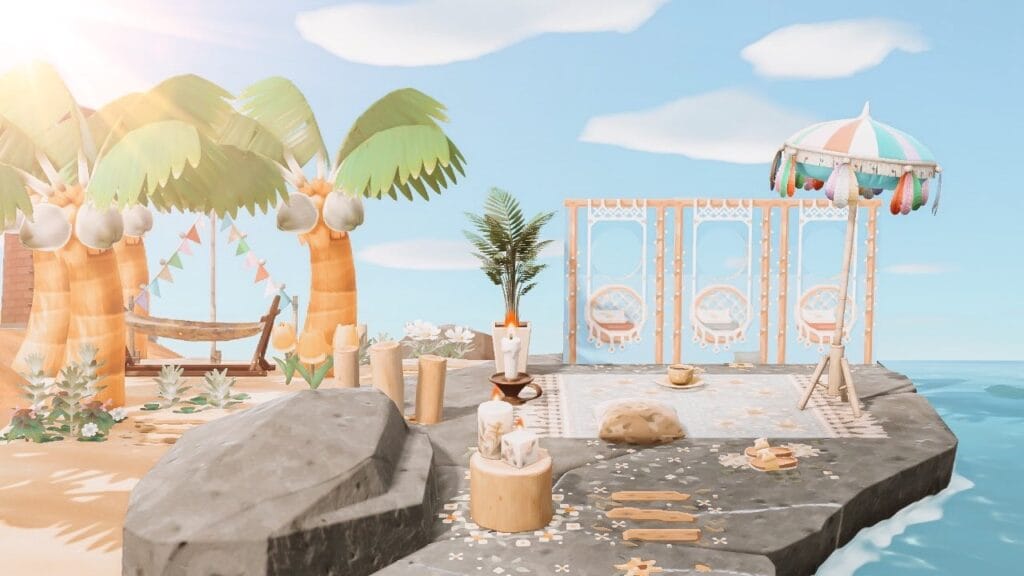 This is the perfect little getaway spot right on the rocky part of the beach! It uses lots of light wood and pastel colors to keep things feeling airy and bright. The hammock between the palm trees is super inviting, but the coolest part is the backdrop that looks like macrame hanging chairs.