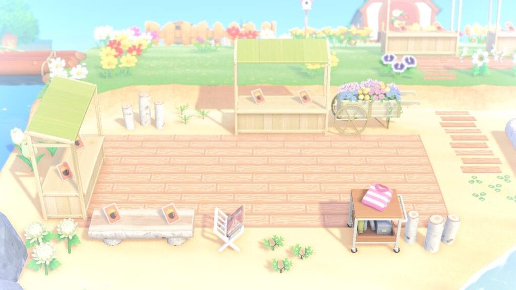 This is such a smart way to handle extra DIY recipes! The creator made a lovely boardwalk area right on the sand using a custom wooden deck design. It feels like a little community trading post with those stalls set up to display the recipe cards.