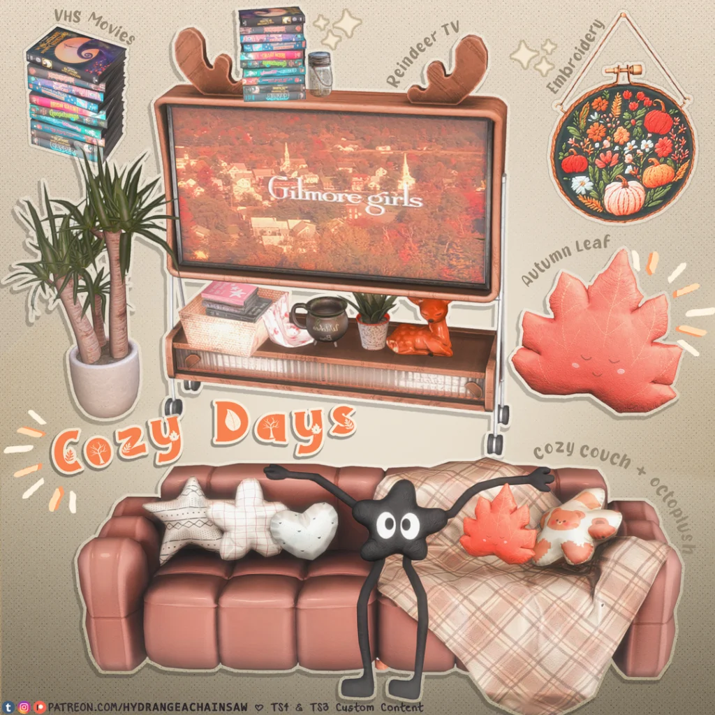 Stepping into this collection feels like a warm hug. The couch piled with whimsical pillows, reindeer-themed TV, and charming autumn accents instantly made my Sims’ living room feel homey.