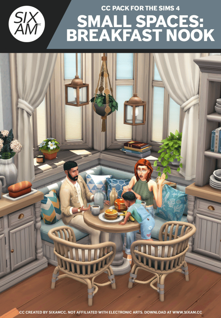 The table and chairs fit perfectly without overcrowding, and it’s such a cozy spot for morning coffee or casual meals. My Sims’ tiny kitchens have never looked so inviting.