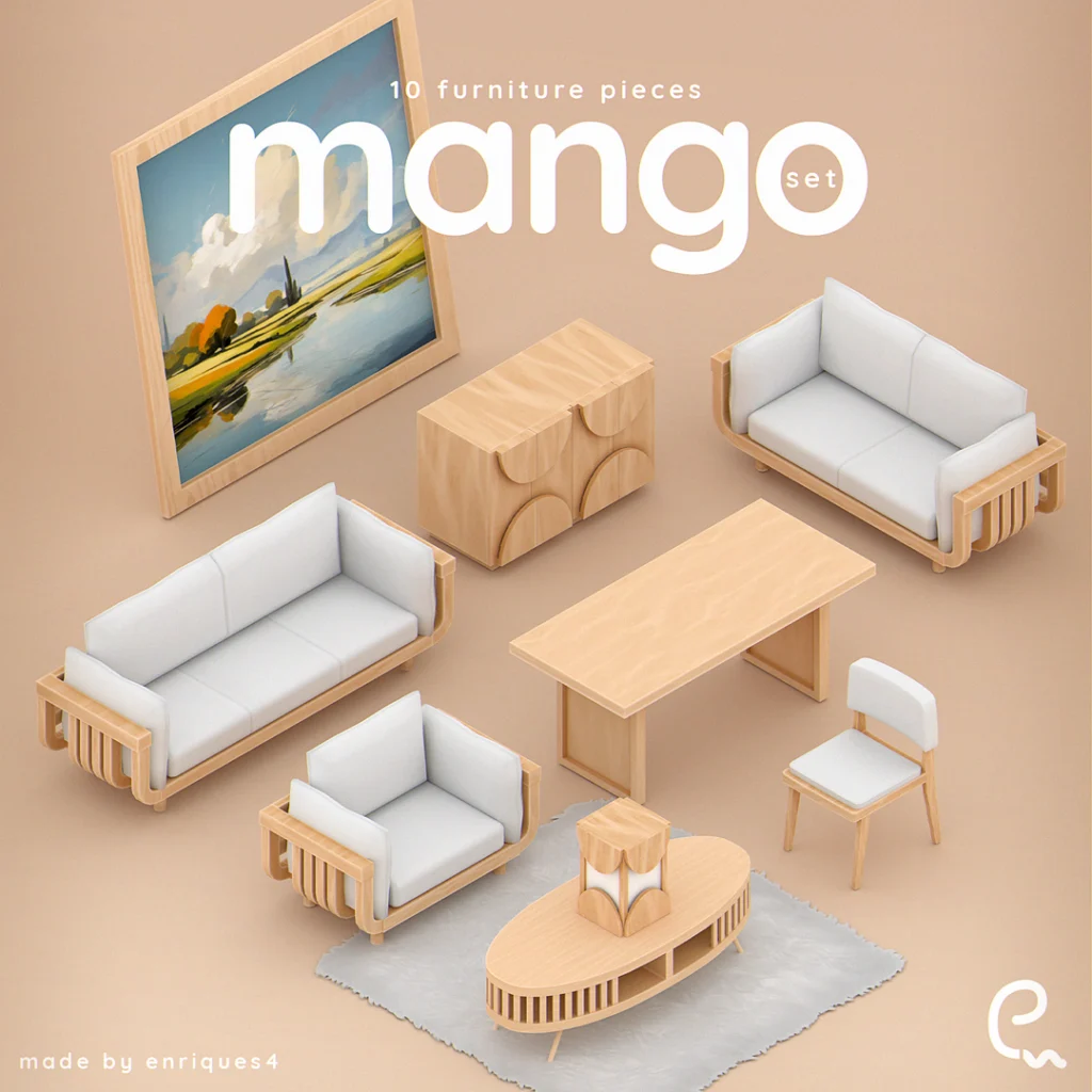 The Mango Furniture CC instantly upgraded my Sim’s living room. Sleek sofas, stylish chairs, and a unique coffee table all shine in warm wood tones.