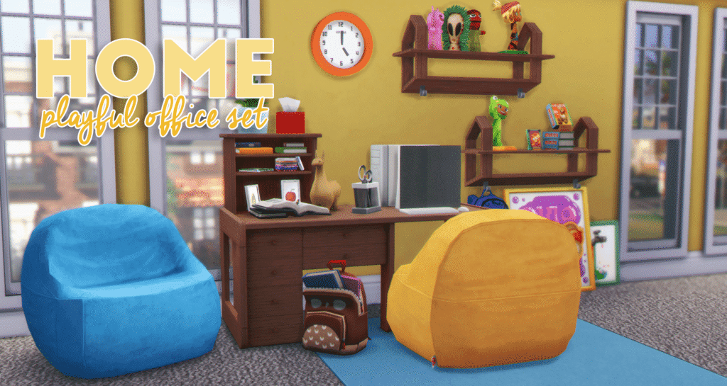 I couldn’t resist creating a silly, colorful office with this set. It’s fun, bright, and perfect for younger Sims. Each piece sparks creativity and adds personality.