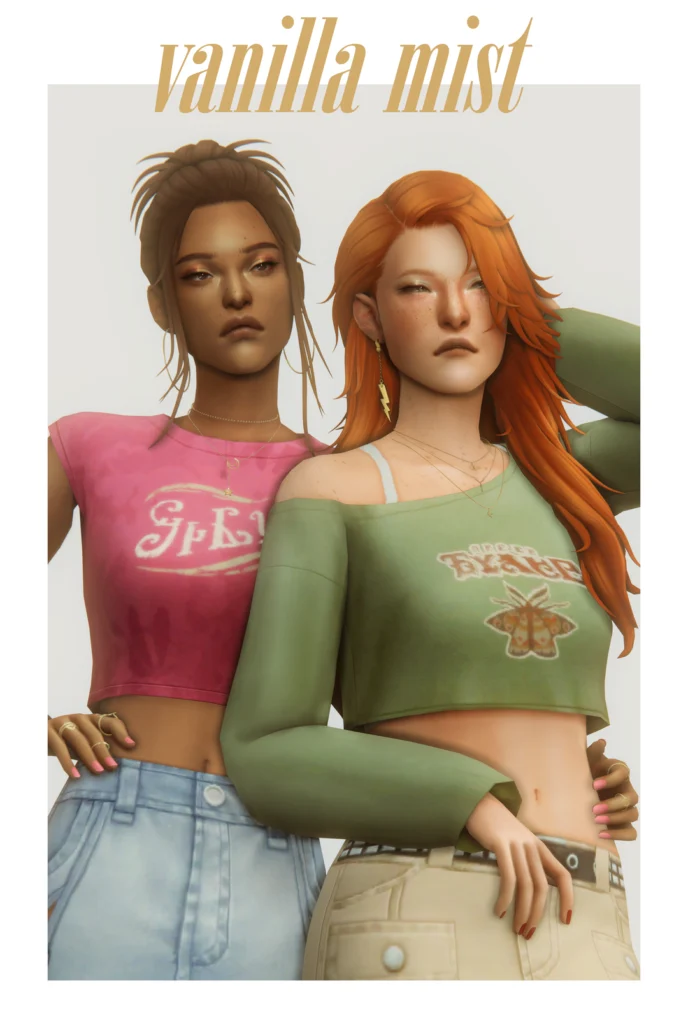 I’m always drawn to Simlish graphics on shirts, so this one instantly became a favorite. The fun prints make every outfit feel authentic to the Sims world.