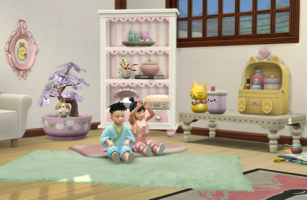 Add a soft pop of personality to your kid’s room with this kawaii-style CC pack. It’s loaded with cute clutter like teddy bear chairs, organizing boxes full of toys, tiny sculptures, and even cosmetics.
